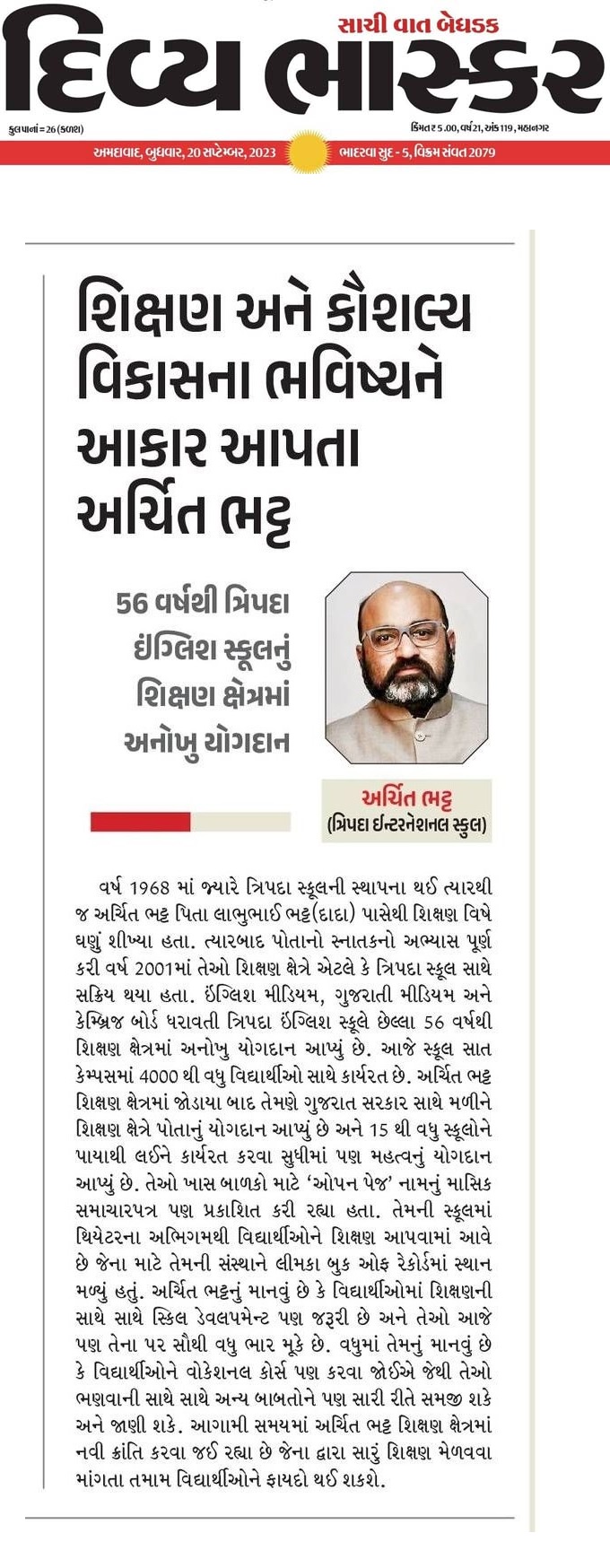 He carried forward this zest and is now managing the Tripada Group of Schools widely known as Tripada Parivar, having three school campus in Naranpura & Rannapark area of Ahmedabad, 2 Campus at Viramgam with a Gurukulam concept and on International Baccalaureate affiliated campus at Gandhinagar.